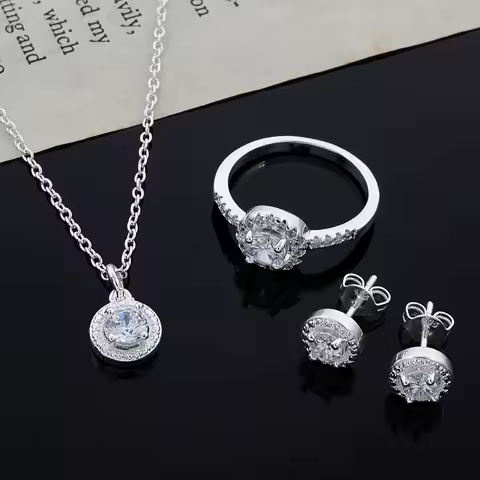 925 스털링 실버 귀여운 솔리드 크리스마스 선물 고귀한 패션 우아한 여성 반짝 이는 크리스탈 CZ 목걸이 귀걸이 반지 쥬얼리 세트