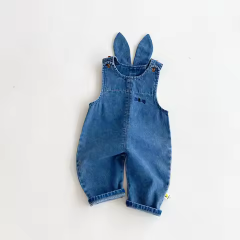 토끼 귀가 달린 가을 겨울 베이비 데님 작업복, 귀여운 긴 바지와 원피스 바지