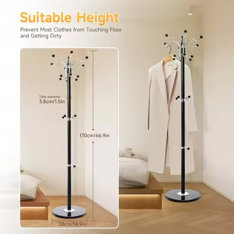 Freestanding Coat Rack with 15 Hooks, Sturdy Metal Hall Tree for Jackets, Hats, Bags in Entryway, Bedroom, Office